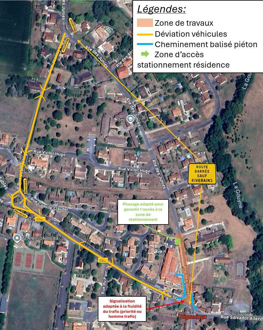 • une déviation sera mise en place depuis le carrefour sud, par la rue du Stade et la rue Jeanne Vigier, afin de rejoindre la route des Junies à environ 350 mètres au nord de l’opération.