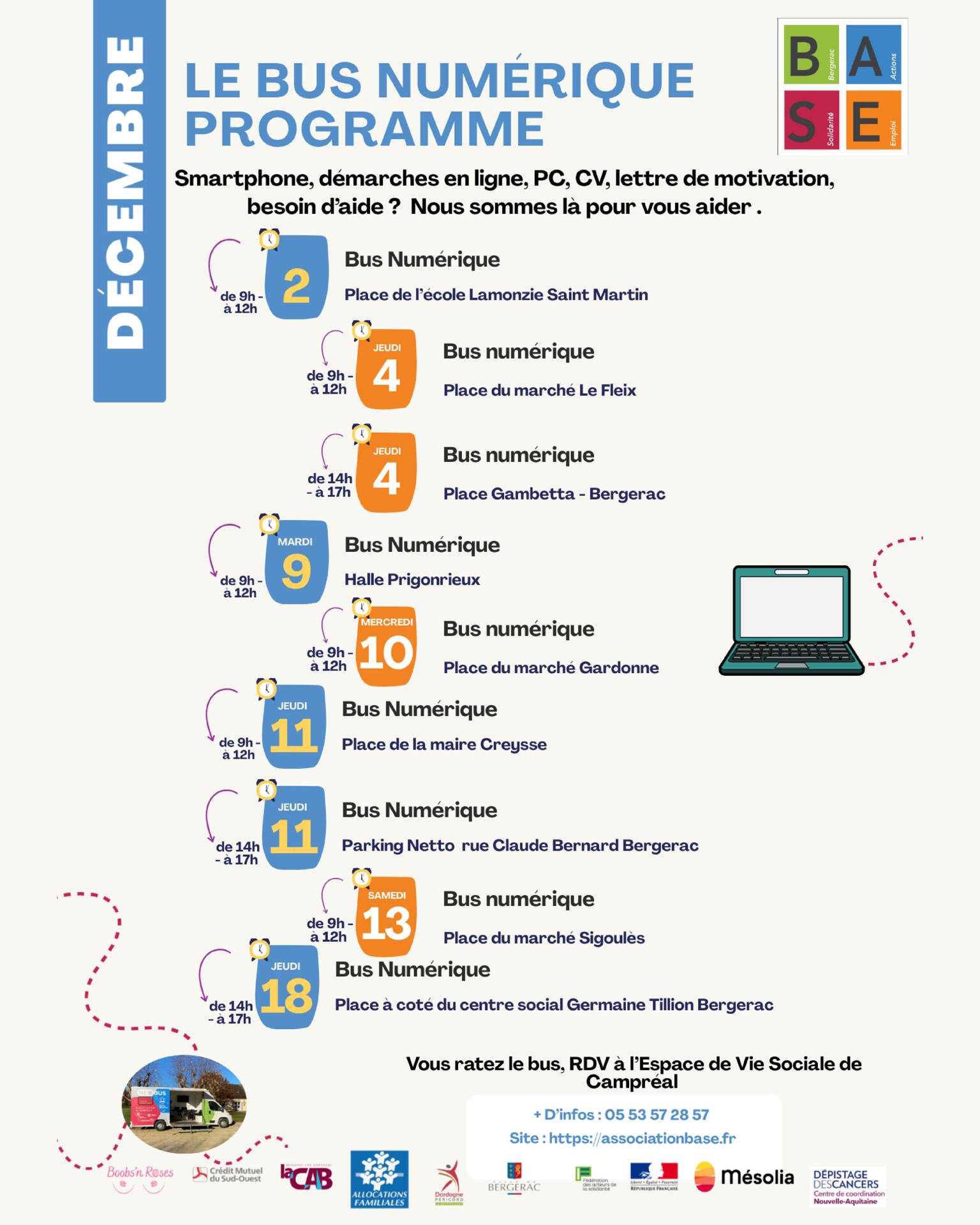 Le bus numérique sera présent mardi 9 décembre de 9h à 12h sous la halle de Prigonrieux.