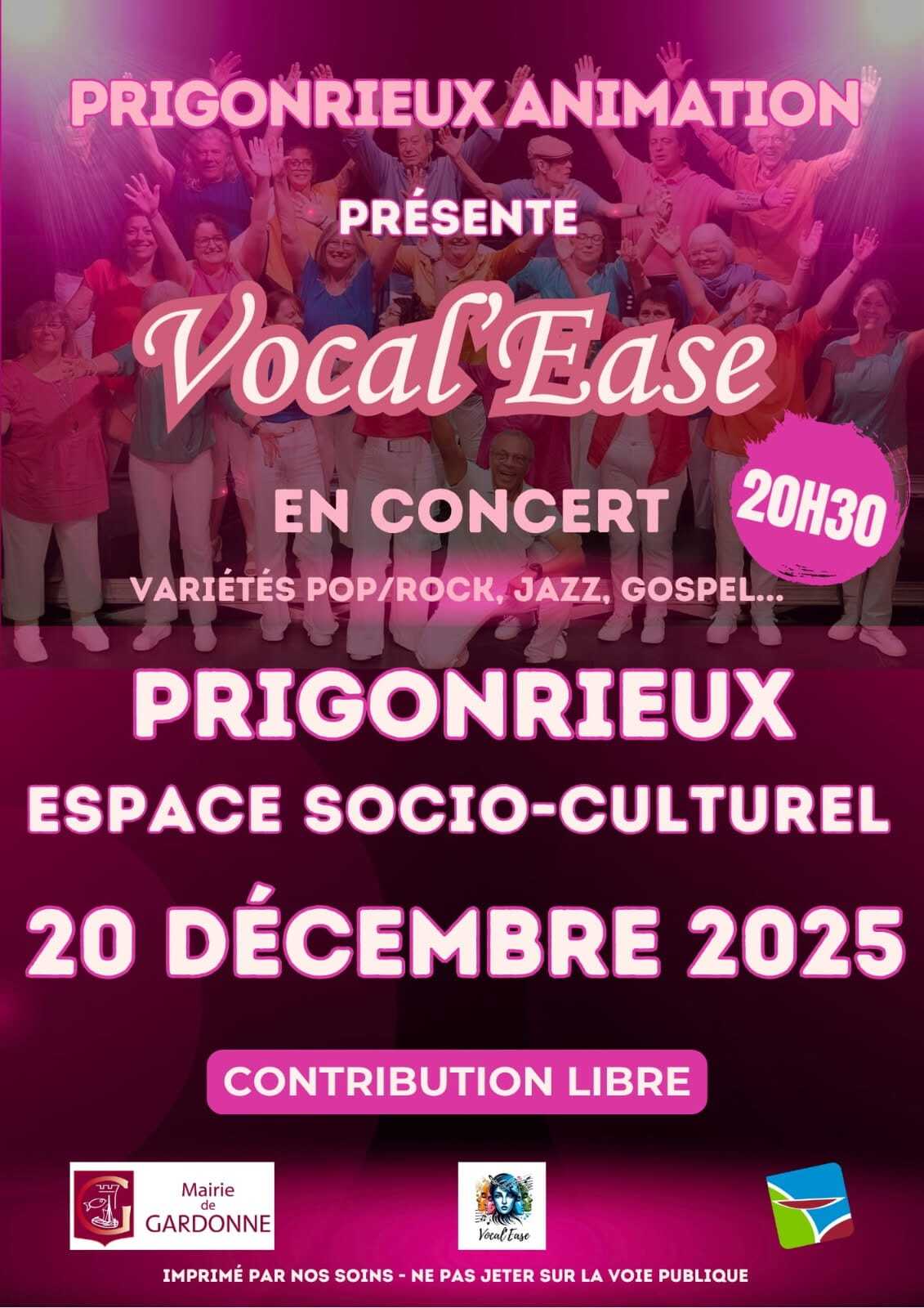 Le groupe Vocal'Ease sera en concert le samedi 20 décembre 2025 à 20h30, à l’Espace socio-culturel de Prigonrieux.